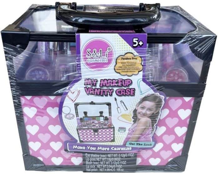 מזוודת איפור לבבות המכילה שיפתונים לקים ליפ גלוסים וצלליות קרם.