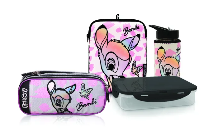 סט האביזרים כולל קלמר מתרחב, קופסת אוכל בכיסוי תרמי ובקבוק שתייה בכיסוי מבודד.