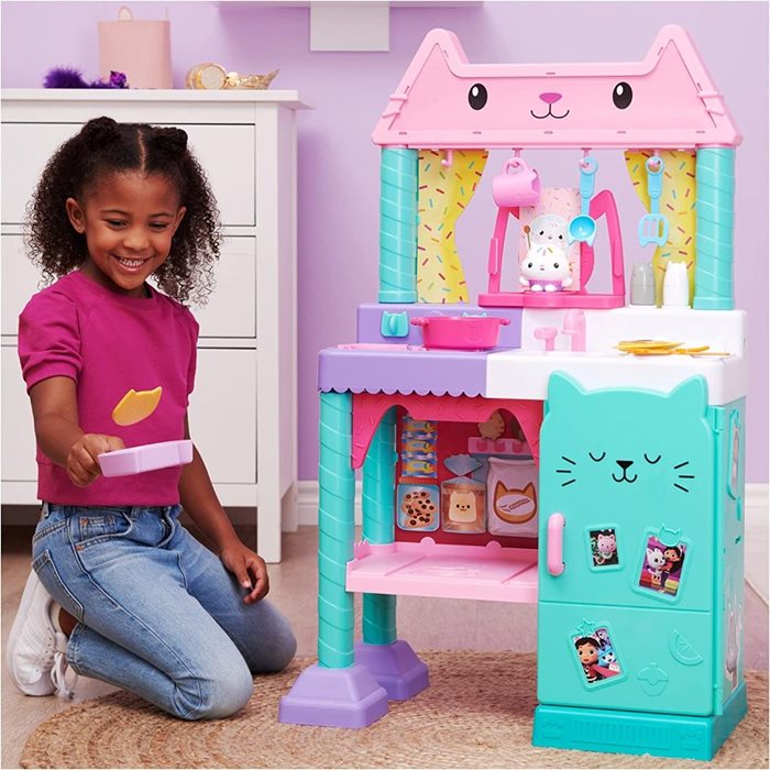 המטבח מגיע עם 10 אביזרי מטבח, 9 חלקי אוכל ואפילו מקרר צעצוע עם תמונות של גבי.
