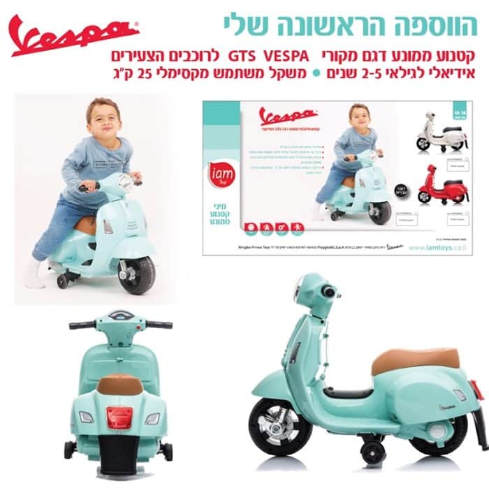 קטנוע ווספה ממונע לילדים דגם מקורי GTS VESPA מגיע בשלושה צבעים מהממים.